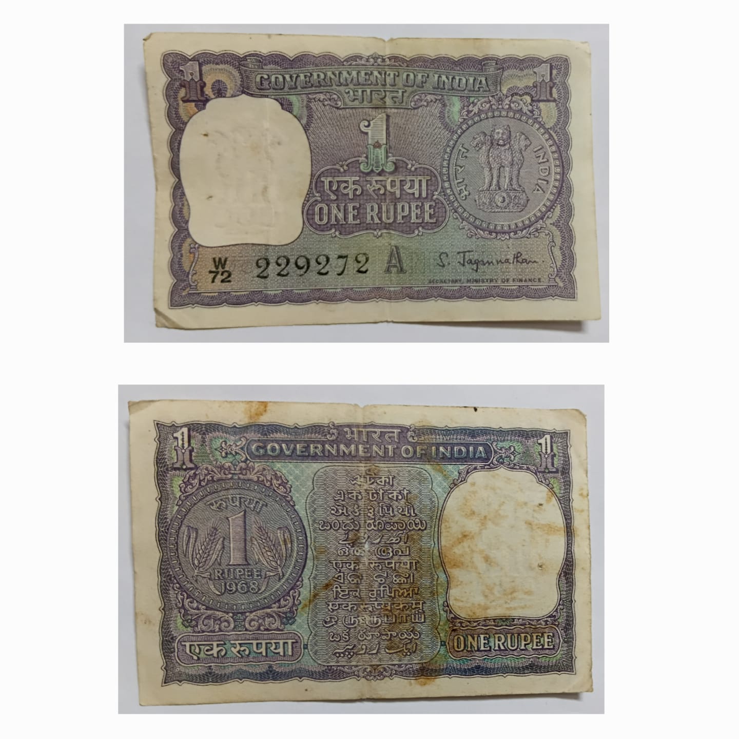 1 Rupee Governor S.Jagannathan Inset A 1968 USED Slightly stained