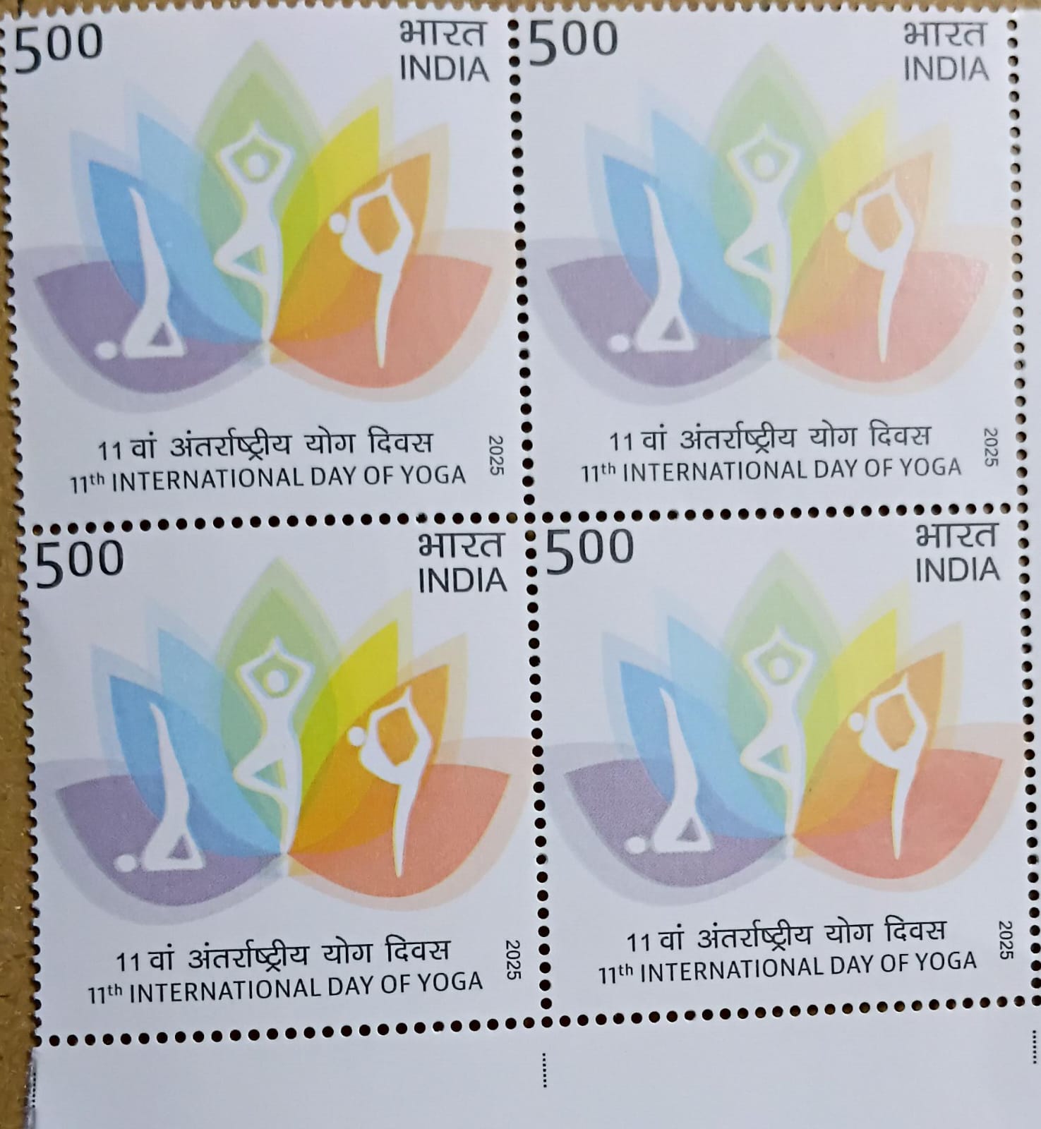 11th International Day of Yoga, Rs. 5 (Block of 4 MNH Stamps). Collectible philatelic item. Stock image shown.
