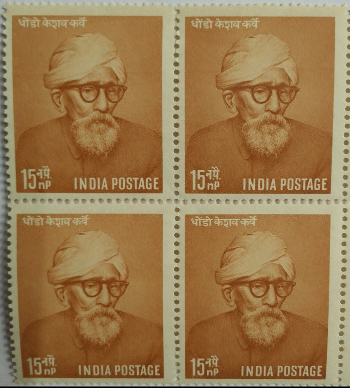 18 Apr. 58 Dr.?Dhondo Keshav Karve. Personality, Social Reformer, Bharat Ratna, Education, 15 nP. (Hinged Block of 4)