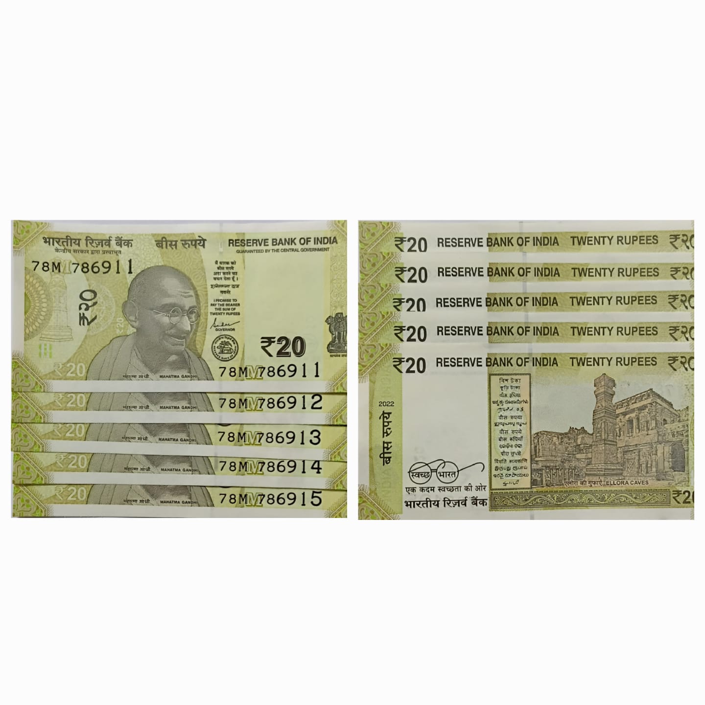 20 Rupees Governor Shakti Kanta Das Star Inset M 2022 UNC 786 SERIES (78 M 786911-78 M 786915) 5 NOTES