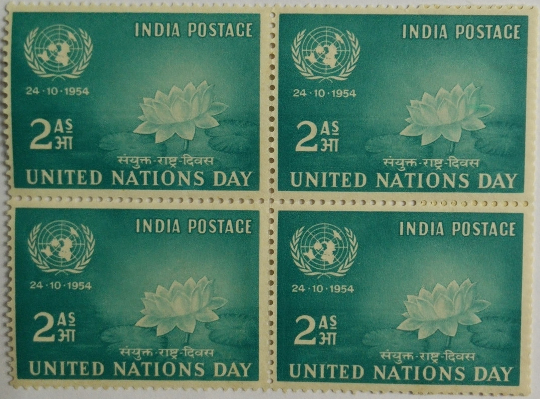 24 Oct. 54 United Nations Day. Emblem, Lotus, Organisation, 2 Anna. (Hinged Block of 4)