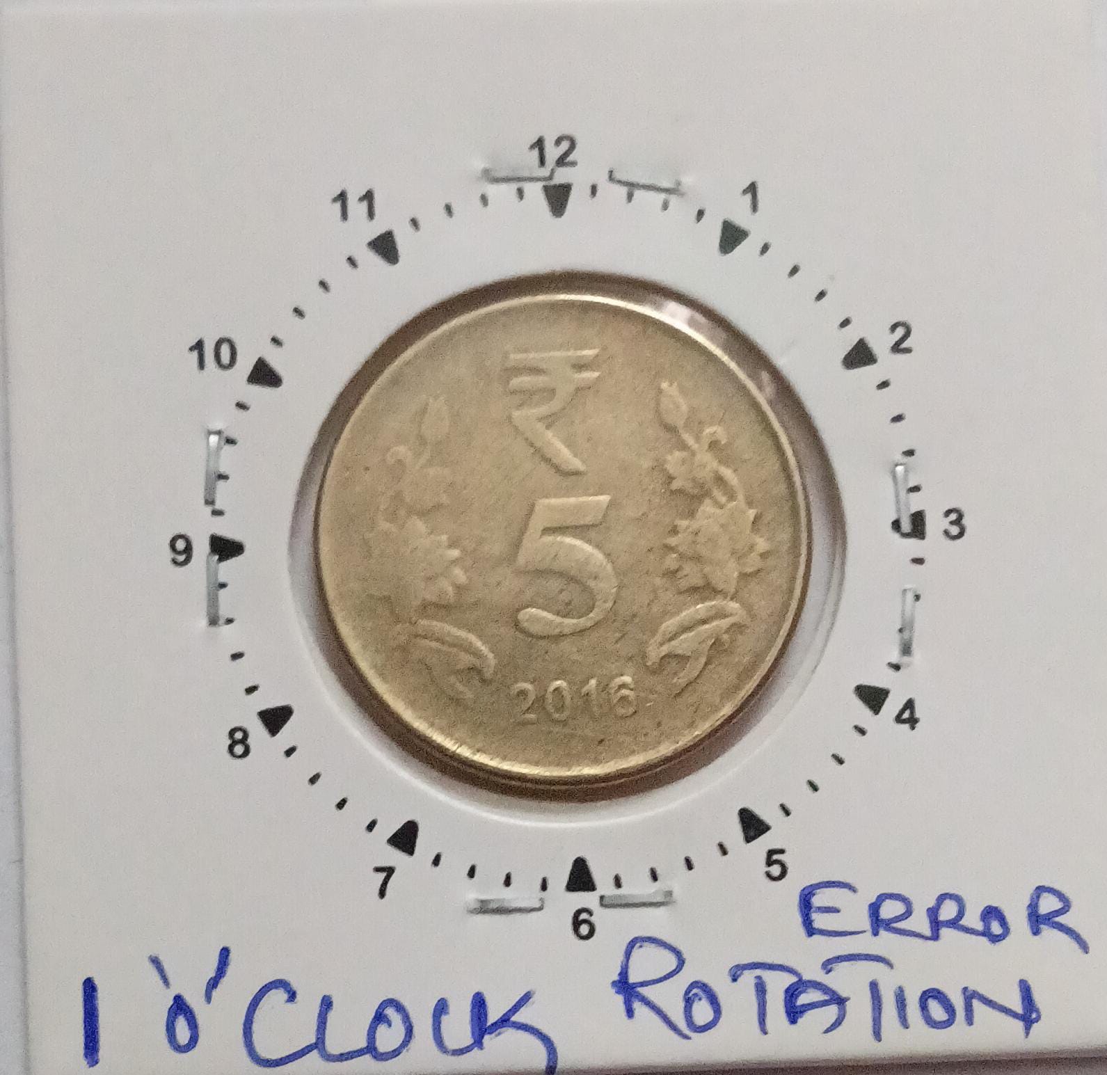 5 RUPEES 2016 KOLKATTA MINT 1 O’CLOCK ROTATION ERROR COIN USED