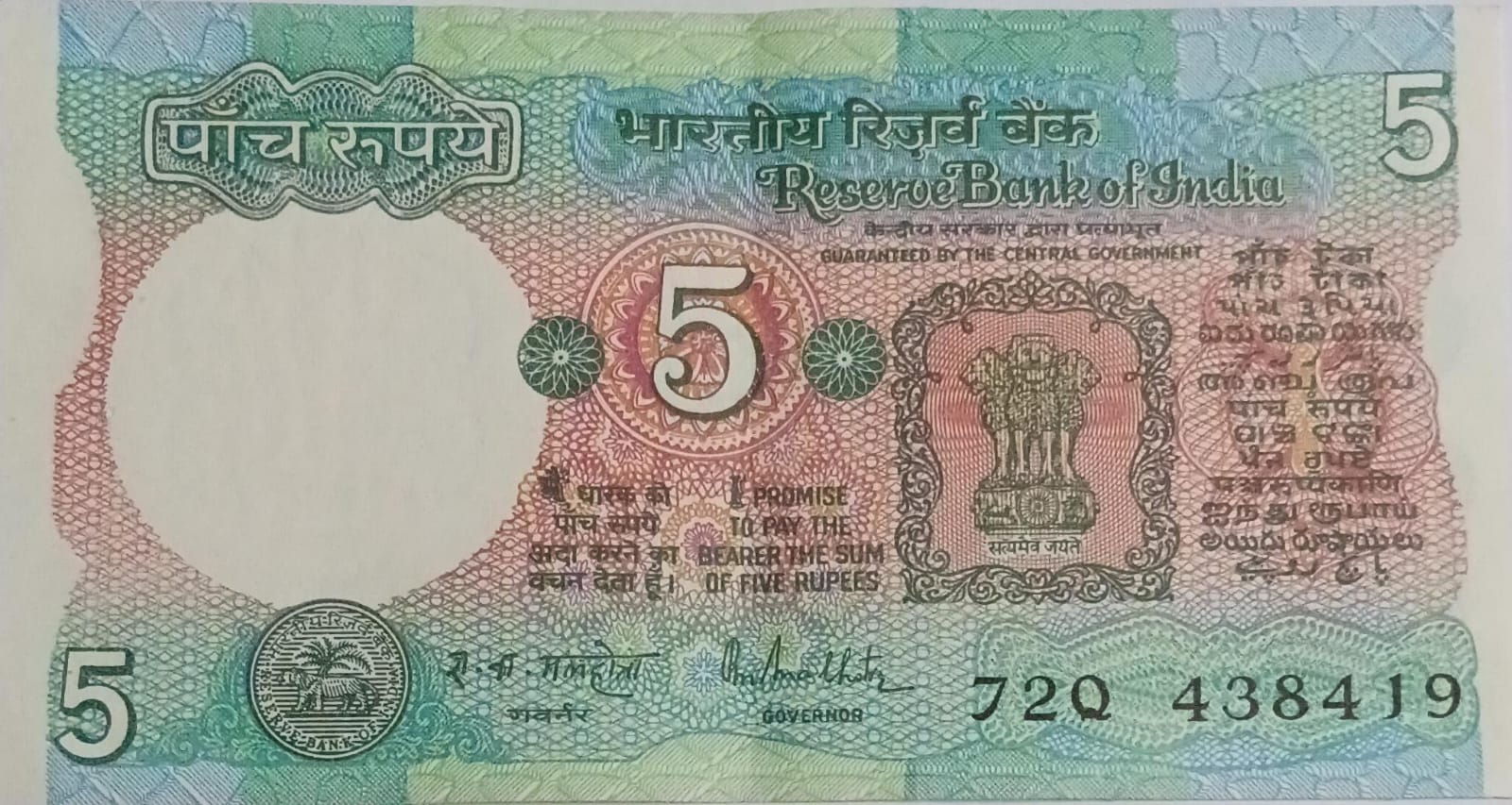 5 Rupees note Governor R.N.MALHOTRA Plain Inset 1988 UNC 72 Q 438419