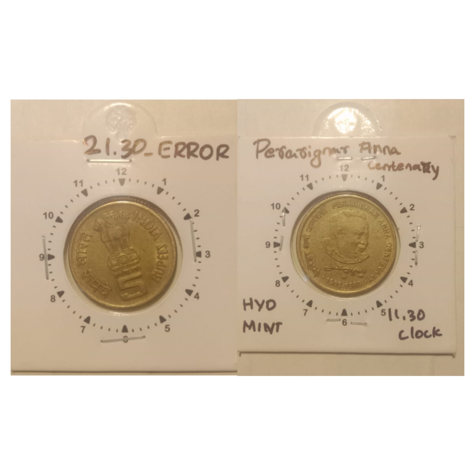 5 Rupees – PerArignar Anna- HYDERABAD MINT 11.30 CLOCK ROTATION ERROR COIN USED