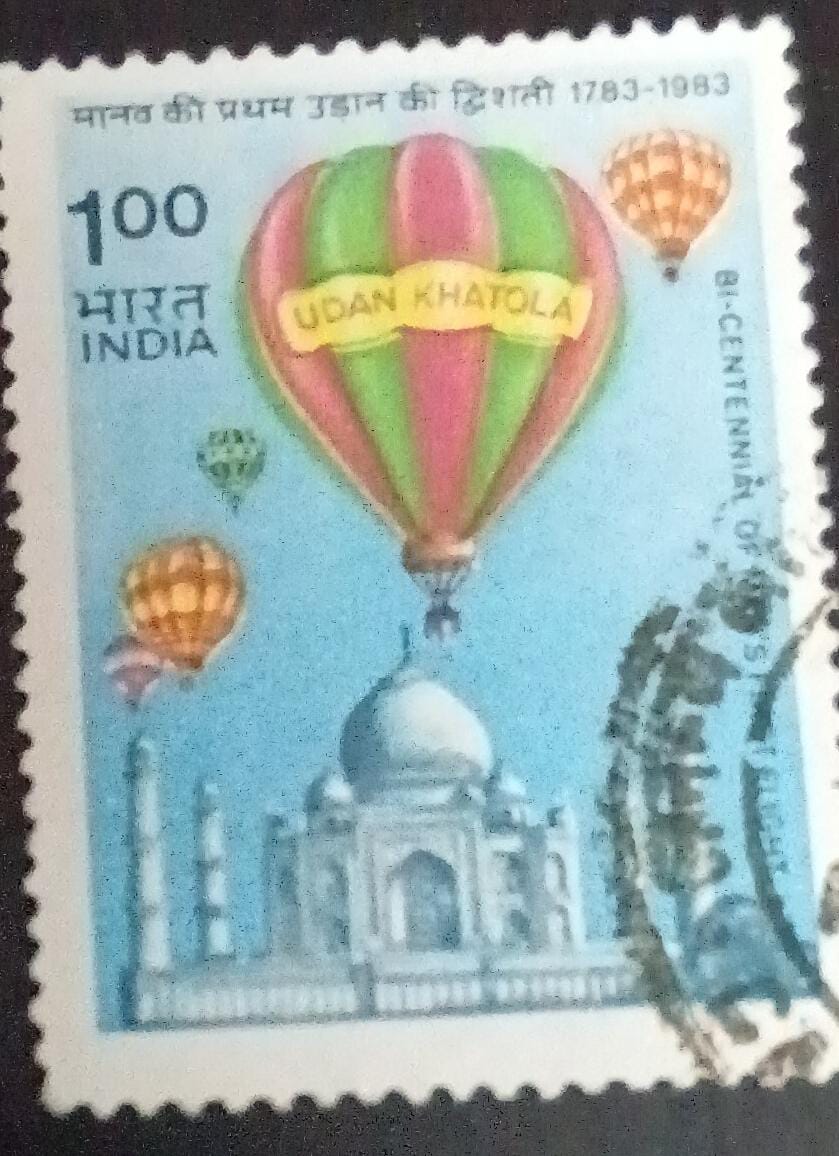 Bicentennial of Man’s First Flight 1783-1983 : Udan Khatola. Hot-air Balloons, Taj Mahal, Manned Flight Rs. 1 Used Stamp