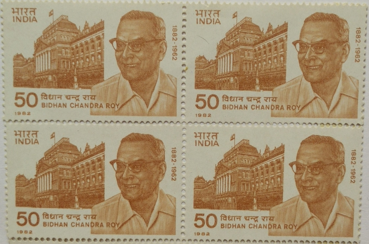 Bidhan Chandra Roy. Personality, Freedom Fighter, Physician, Politician, Indian National Congress, Chief Minister, Bharat Ratna, Building, Flag, 50 P. (Block of 4 stamp)