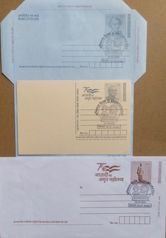 Engineers Day (Belagavi) Special Cancellation On Postal Stationary Envelope Inland Letter & Postcard Released On 15-09-2023