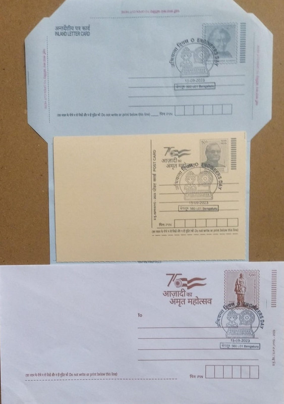 Engineers Day (Bengaluru) Special Cancellation On Postal Stationary Envelope Inland Letter & Postcard Released On 15-09-2023. Collectible item. Stock image shown.