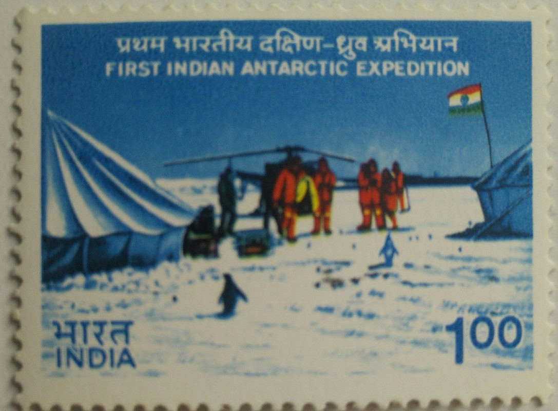 First Antarctic Expedition. Scientific Expedition, Flag, Tent, Scientists, Antarctica, Research, Penguin Rs. 1 (Hinged/Gum washed stamp)