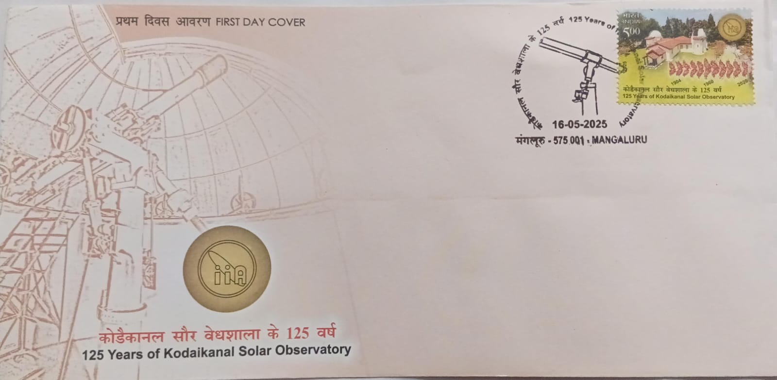 First Day Cover 16 May2025 125 Years Of Kodaikanal Solar Observatory (Fdc-2025). Collectible philatelic item. Stock image shown. A great collectible for philatelists and thematic stamp collectors.