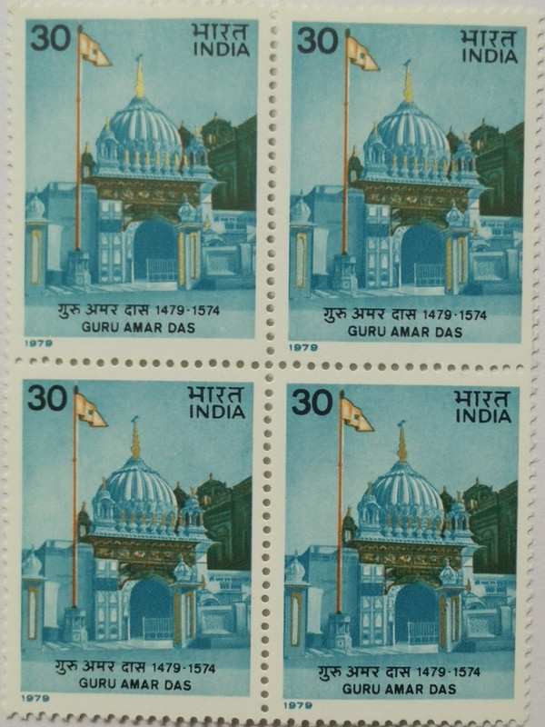 Guru Amar Das. Personality, Religious Leader, Gurudwara, Sikhism, Flag, Building, Baoli Sahib Temple, 30P. (Block of 4 stamp)