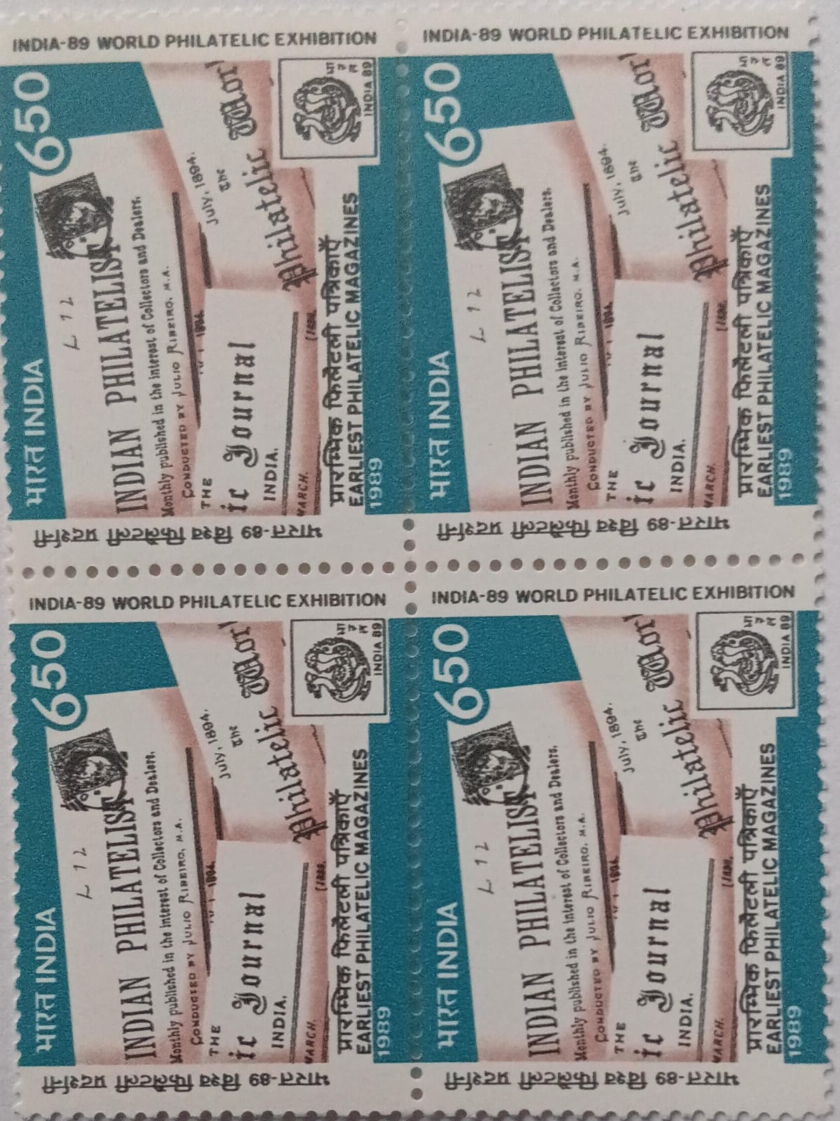 India-89, World Philatelic Exhibition, New Delhi Philatelic Exhibition, Emblem, Stamp Show, Philatelic Magazine, Philatelic Journal Rs. 6.50 -Block of 4 Stamp