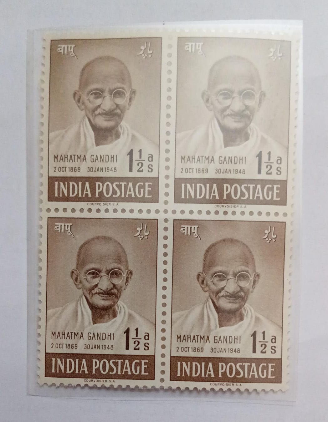 India Stamps – 1st Anniversary of Independence – Mahatma Gandhi Mourning Issue – Hinged Block of 4
