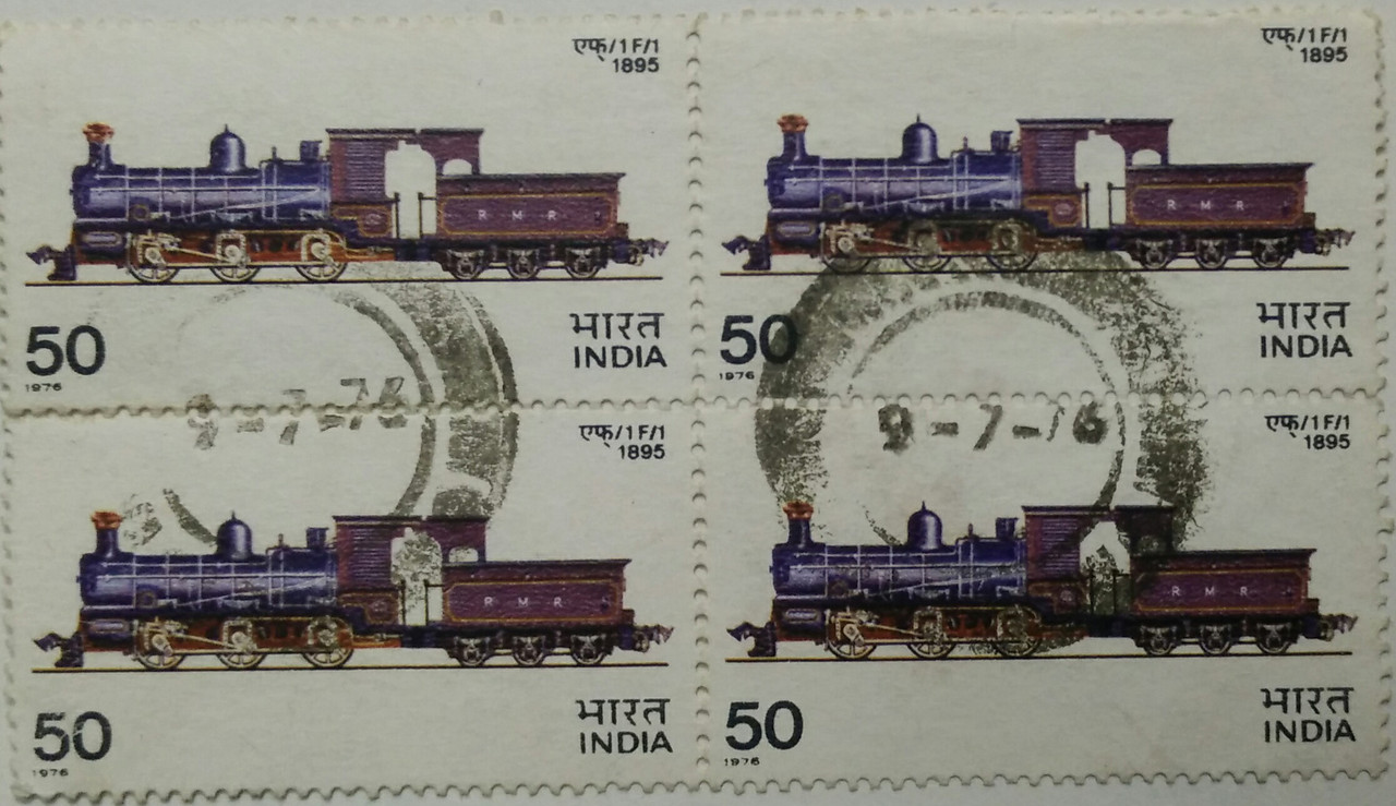 Indian Locomotives – 1F/1 1895. Railway, Locomotive, Steam Engine, Metre-Gauge, 50 P. (Used Block of 4 stamp)