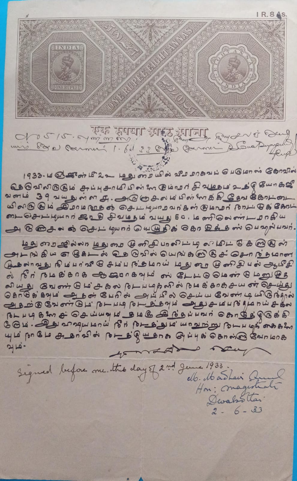 Indian stamp paper 1 rupee 8 Annas-Government of India-GEORGE V watermark “ONE RUPEE UNDER TEN”1945