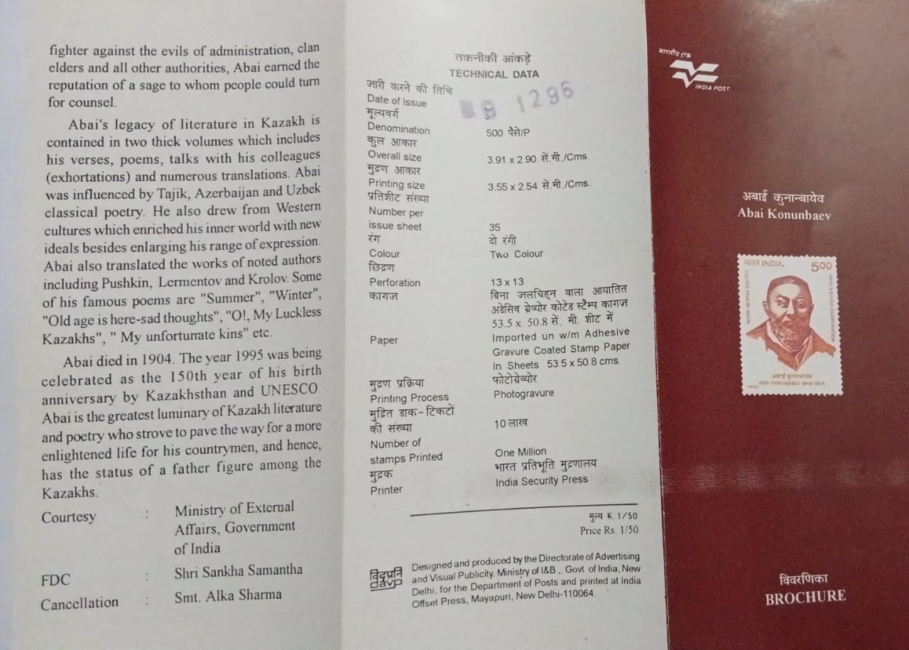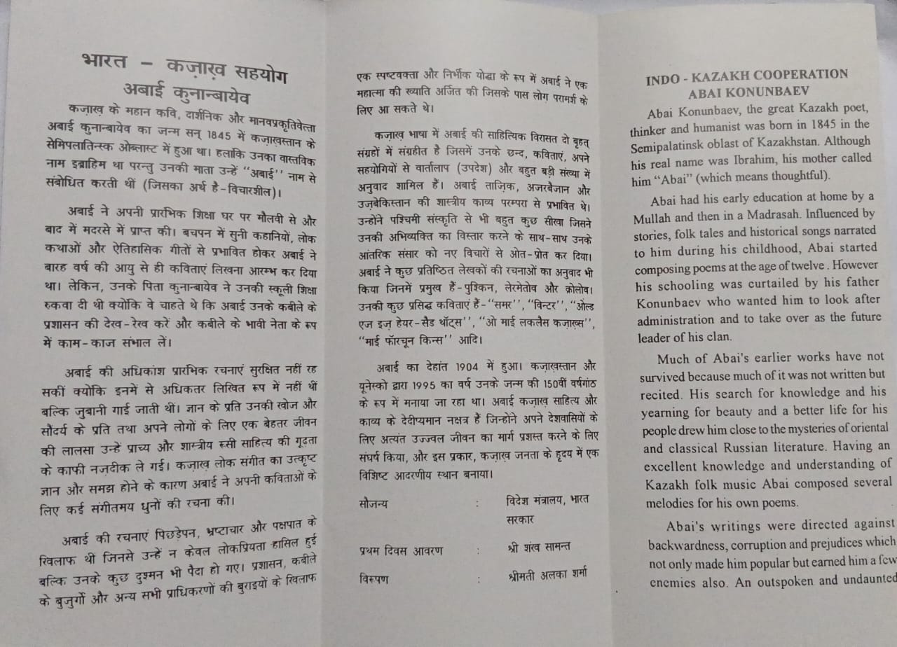 Indo-Kazakh cooperation. 150th Birth Anniv.of Abai konunbaev (BR)