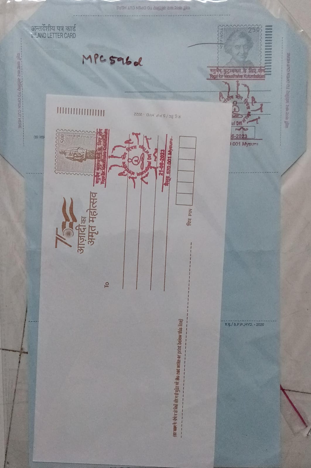 International Day OF Yoga (Mysuru) Special cancellation on Postal stationary Envelope & Inland letter Released on 21-06-2023