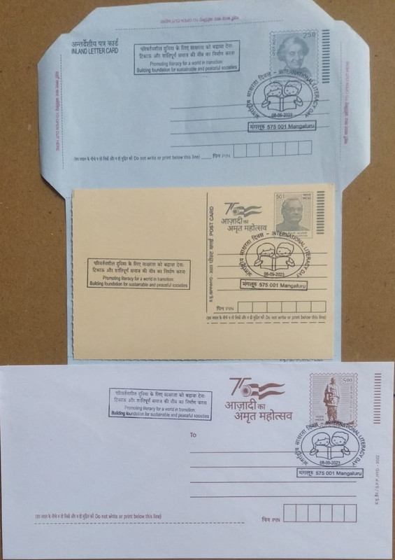 International Literacy Day (Mangaluru) Special cancellation on Postal stationary Envelope Inland letter & Postcard Released on 08-09-2023