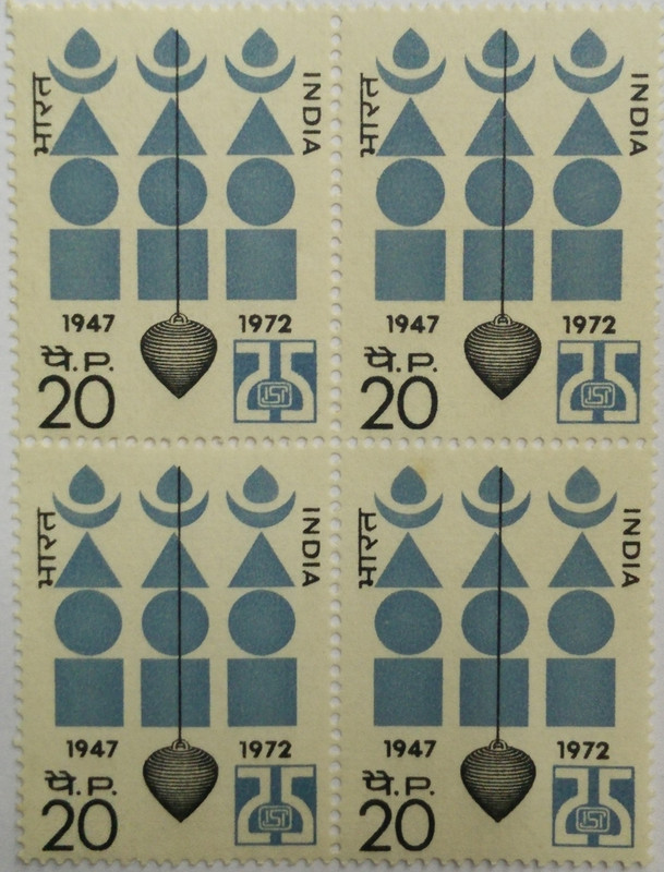 ISI Silver Jubilee. Emblem, Silver Jubilee, 25 Figure, Organisation, BIS, ISI, Elements, Earth, Water, Fire, Air, Plummet, Quality, Control, 20 P.(Hinged Block of 4)