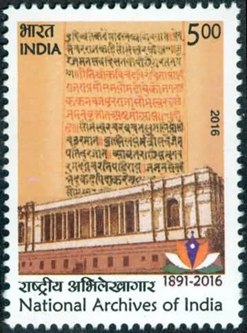 National Archives of India Archives, Building, Emblem, Manuscript, Records Rs. 5 (Hinged/Gum washed stamp)