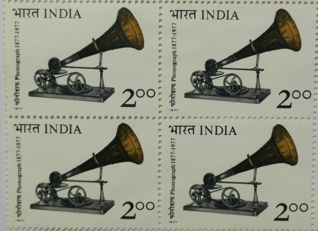 Phonograph – Centenary of Sound Recording. Berliner Gramophone, Music, Instrument, Record Player, Gramophone, Rs.2 (Block of 4 stamp)