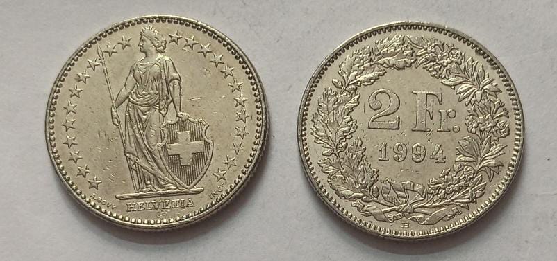SWITZERLAND 2 France 1994 Confoedertio Helvetica Coin (used)