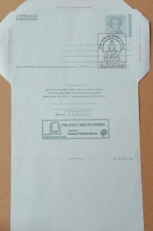 Tirthankar Mahaveer Jayanti Greetings (Mysuru) Special cancellation on Postal stationary Inland letter Released on 04-04-2023