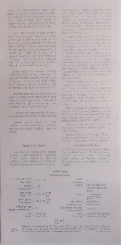 Vinoba Bhave Personality, Acharya, National Teacher of India, Gandhian, Non Violence, Bhoodan Movement (SBR)